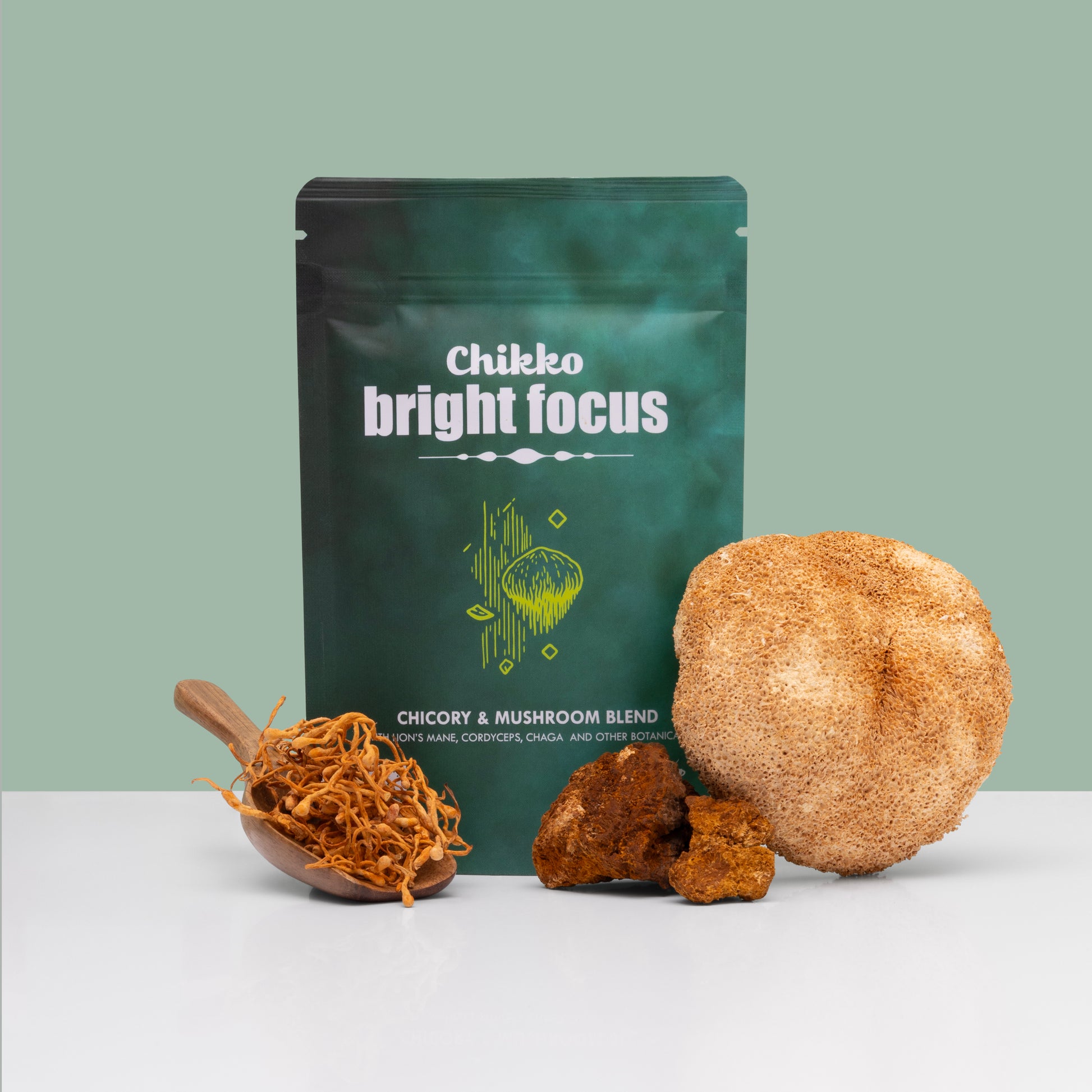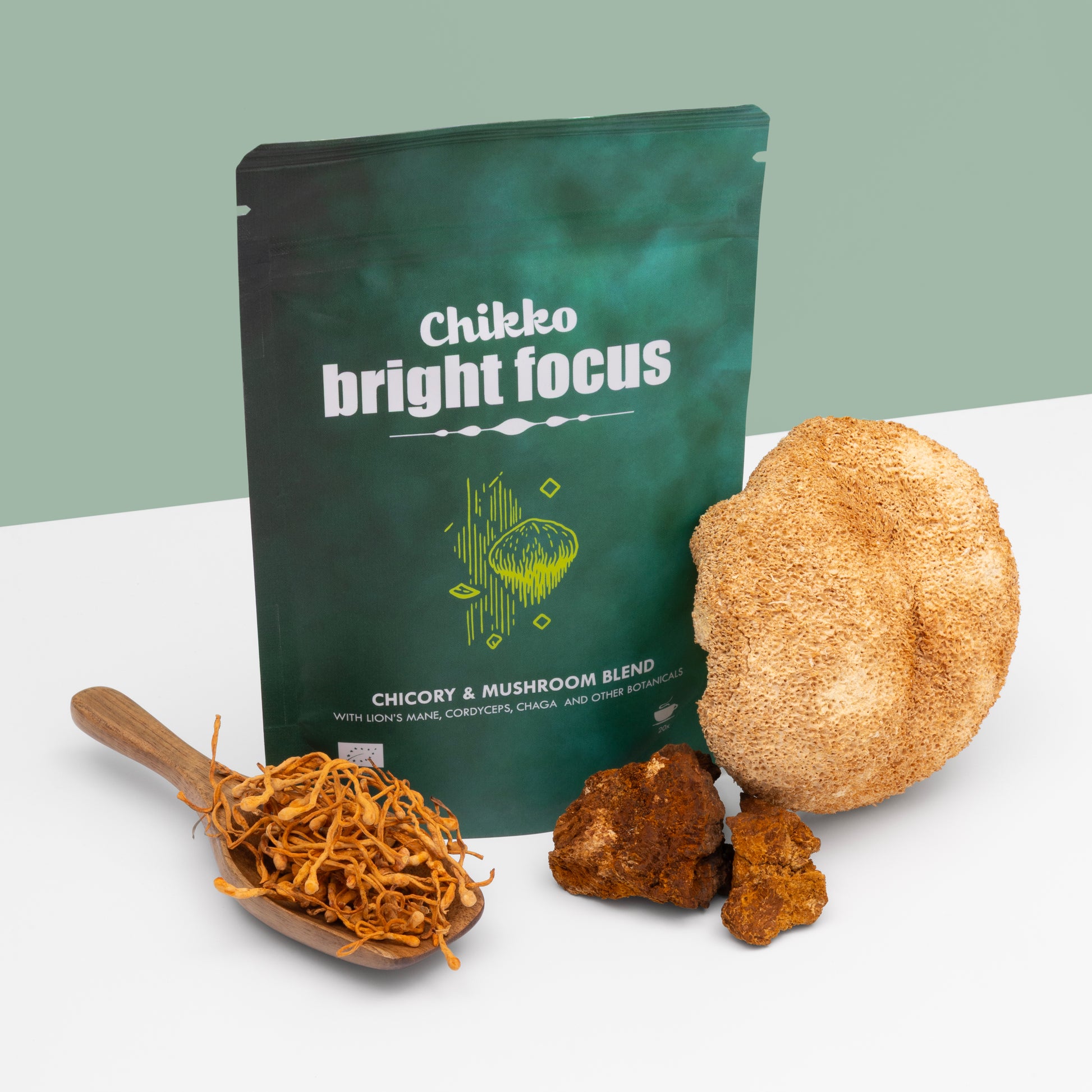 De Chikko Bright Focus lijkt niet gewoon op koffie, het is meer dan dat. Geroosterde cichorei zorgt voor de vertrouwde smaak van koffie, een mix van gele maca, lion’s mane, cordyceps, maitake en chaga zorgen voor een diepe en zachte aardse smaak. Gelaagd, vol en subtiel nootachtig.